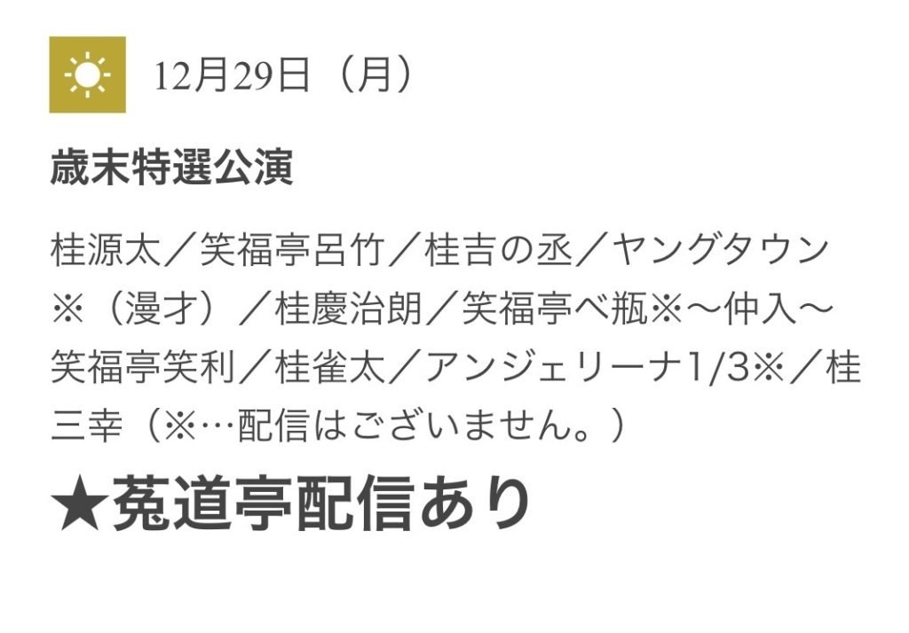 | 出演者 | 桂源太/笑福亭呂竹/桂吉の丞/ヤングタウン※(漫才)/桂慶治朗/笑福亭ベ瓶※~仲入~笑福亭笑利/桂雀太/アンジェリーナ1/3※/桂三幸 ※配信なし |